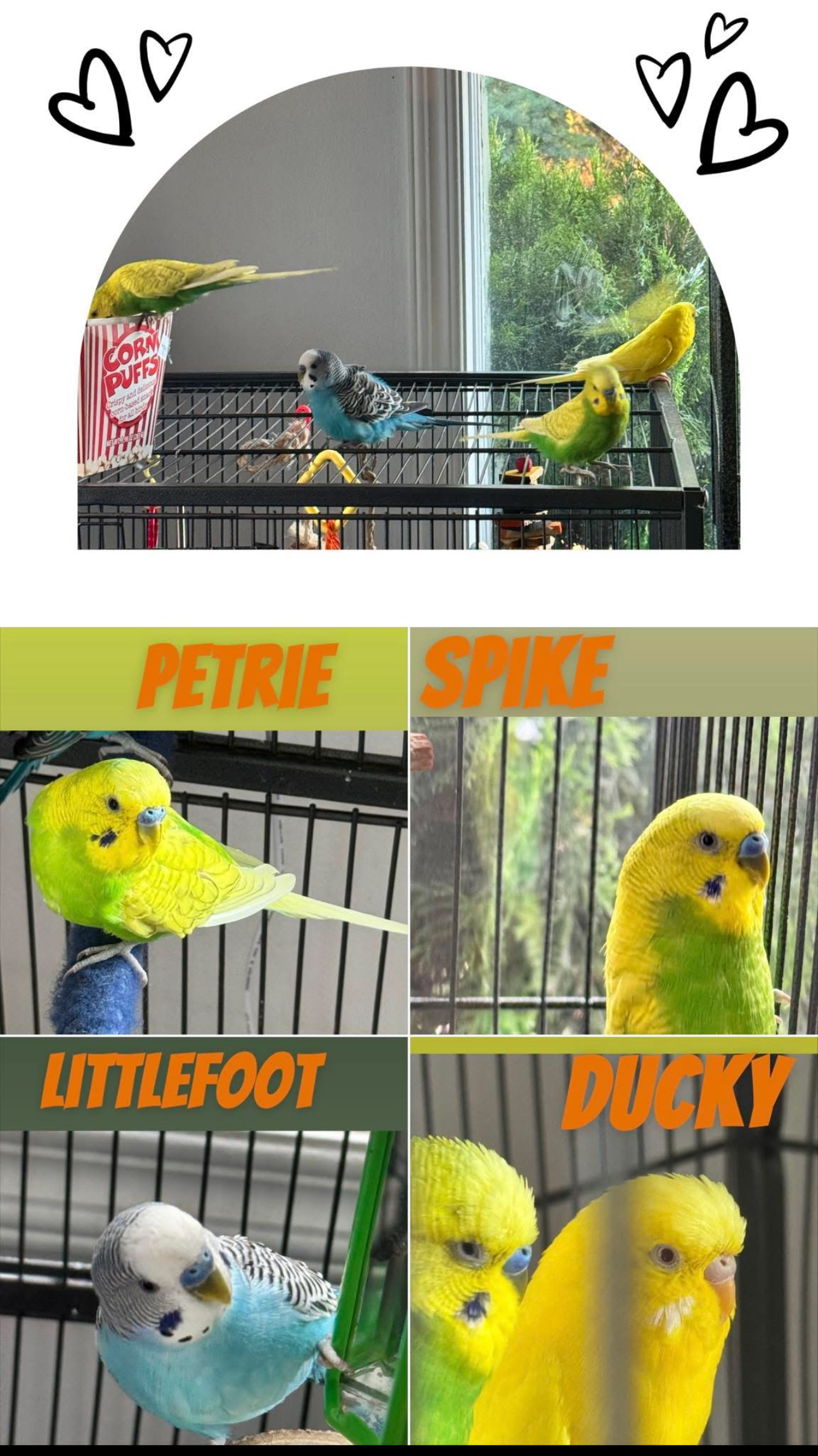 đŚâ¨ Calling all dinosaur fans! Meet our four prehistoric pals Petrie, Ducky, Littlefoot, and Spike! These courageous boys escaped a disastrous âextinction eventâ (a neglectful breeding/budgie hoarding situation) and are on the lookout to get to the legendary Great Valley! Theyâre not hand-tamed and their exact ages are a mysteryâjust like real dinosaurs! đŚ Included: A spacious cage perfect for little dinosaurs! Personalities: Gentle, non-destructive, and happiest when stretching their wings together in true herd style. Wish List: A patient, budgie-loving human(s) ready to give these prehistoric friends the real âhappily ever afterâ they deserve. Can you help these tiny dinos leave extinction behind and find their Great Valley? Start your adoption adventure by filling out an application for them on our website! Bring home a piece of prehistory đŚ đŚ ****click on the photo to enlarge****
